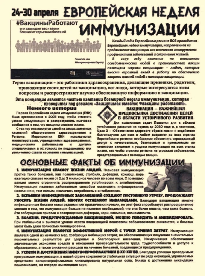 В связи с проведением с 24 по 30 апреля Европейской недели иммунизации, обращаем Ваше внимание на важность своевременно проведенной вакцинации. Вакцинация защищает от многих инфекционных заболеваний, а особенно, что очень важно, если заражение произошло, от тяжелых осложнений инфекций. Какие прививки сделать и в какое время можно уточнить у своего участкового терапевта или педиатра. Будьте бдительны! Берегите свое здоровье!
