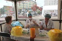 Кроме того, на площади Победы работали три мобильных комплекса: центр здоровья Областного центра медицинской профилактики и реабилитации, передвижной флюорограф Советского противотуберкулезного диспансера, а также передвижной детский стоматологический кабинет Городской детской стоматологической поликлиники. За три часа их посетили более ста человек, в том числе 25 детей. Всего же в акции «Я здоров!» приняли участие более 1,5 тысячи жителей региона.